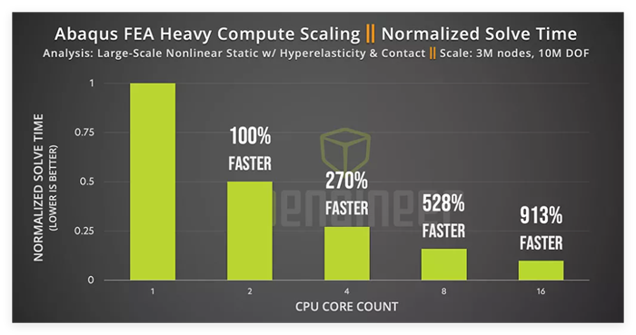 Abaqus 仅需一个 CPU 核心即可求解,但启用更多核心后,速度会立即大幅提升。随着核心数量的增加,由于并行处理开销,速度提升的幅度会逐渐减小。收益递减的程度还取决于模拟的具体情况,显式模拟的扩展性更好。核心速度(频率)对 Abaqus 也至关重要。更高的核心速度可以更线性地提升性能,而不会增加多核开销。