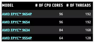 AMD EPYC处理器列表,区分核心和线程。