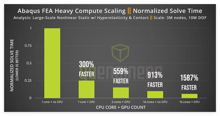 GPU 加速 可以使 Abaqus 的运行速度比自然状态下快数倍。但是,有一些重要的限制条件。 只有部分求解器(例如隐式求解器和 AMS 特征值求解器)适合 GPU 加速,而且待求解的模型必须足够大。此外,Abaqus 需要“双精度”GPU,这意味着只有 NVIDIA 的少数几款产品能够胜任。目前 AMD GPU 尚不支持,但如果用户强烈表达需求,这种情况可能会改变。