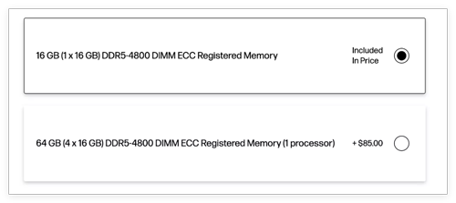 512 GB DDR5 ECC(16x32 GB @ 4800 MT/s) 768 GB DDR5 ECC(24x32 GB @ 4800 MT/s)