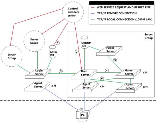 5- 这条连接也是一条本地的TCP/IP连接,它用来进行公共信息服务器和数个游戏服务器间的交互,用来交换一些游戏世界级的信息(比如公会信息,跨服组队信息,跨服聊天频道等)。