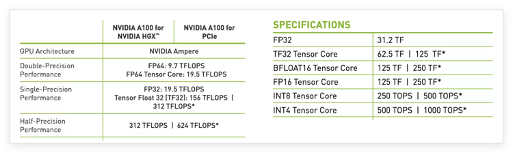 面向计算的NVIDIA A100(左图)官方数据手册列出了双精度(FP64)性能。而 面向AI/渲染的NVIDIA A10(右图)数据手册则没有列出。