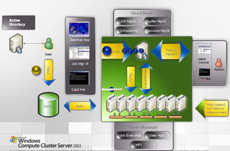 因此,微软遂以Windows Server 2003操作系统为核心,继而加入了诸如MPI、作业调度程序、集群计算工作管理员等重要HPC的套件,孕育出Windows Compute Cluster Server 2003(以下简称WCCS 2003)这个专为HPC量身订做的操作系统,同时搭配了包括Active Directory、MOM、Visual Studio等已为市场熟知的技术,让HPC应用不管在于并行计算程序开发、调试,乃至于集群计算环境的监控、管理、部署、设定及安全防护等环节,都不再像从前那般艰深困难。