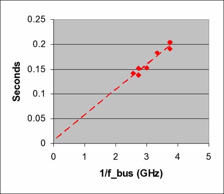 第二台CPU是英特尔公司的酷睿双核处理器Core 2 Duo (Conroe)运行四组频率达到2.66 GHz。这个CPU的数据点和连成的直线用蓝色标注。第三台CPU是英特尔公司的酷睿四核处理器Core 2 Quad(Kentsfield)运行两组频率达到2.4 GHz。它的数据点和连成的直线用红色标注。总线频率(bus frequency)在266 MHz频率下保持恒量。结合方程式(1)和线性图可以清楚的看到β或者M(MBcache) * (1/ fBus )都为零。 #p#page_title#e#