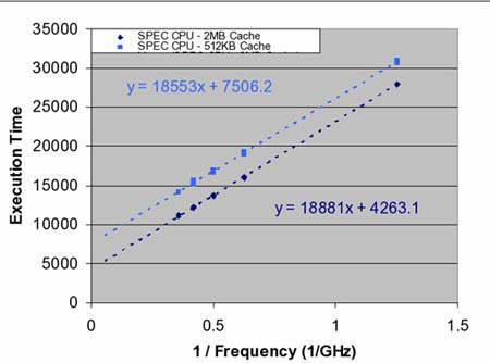 深蓝色的数据点和线性图符合了激活的2MB L3高速缓存存储器的结构。淡蓝色的数据点和线性图则反映了不起作用的L3高速缓存存储器的结构情况,非常有效的把高速缓存存储器的体积精简到了512KB。这两个线性图都是平行线。斜面值是一样的,几乎没什么差别。更有趣的是我们能看到,当高速缓存存储器的体积从512KB变成2MB时,测试值的变化。内存访问和Tmemory完成的时间总计减少了1.75x。这个结论等同于增大了总线(bus)和内存频率1.75x。对于复合工作负载来说,高速缓存存储器的体积非常重要。 #p#page_title#e#