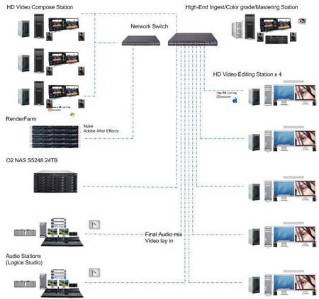 如上图所示,上面是一家很富有的大型制作机构的实际应用流程,围绕不同工作端的特点分别应用到了不同的存储解决方案。在关键业务,比如剪辑,调色上我们需要大量且快速的共享素材,来进行编辑和调色,所以我们做到SAN里面,而合成,配音,渲染业务,我们做到LAN里,其中合成和渲染所要做到在线是很不现实的,而且按每天的工作量来看,其所要生成的数据量并不大,所以我们进行本地配置DAS的同时用 NAS来通过LAN做素材共享,而且SAN里面的内容我们通过MSCserver共享给LAN里面的客户端,通过增加网络带宽聚合解决了SAN与NAS的数据传输,其中NAS在里面起到了文件管理、不同工作组间的权限和配额分配,很完善的解决了数据共享的问题。整个方案是一套跨平台的数据共享解决方案! #p#page_title#e#